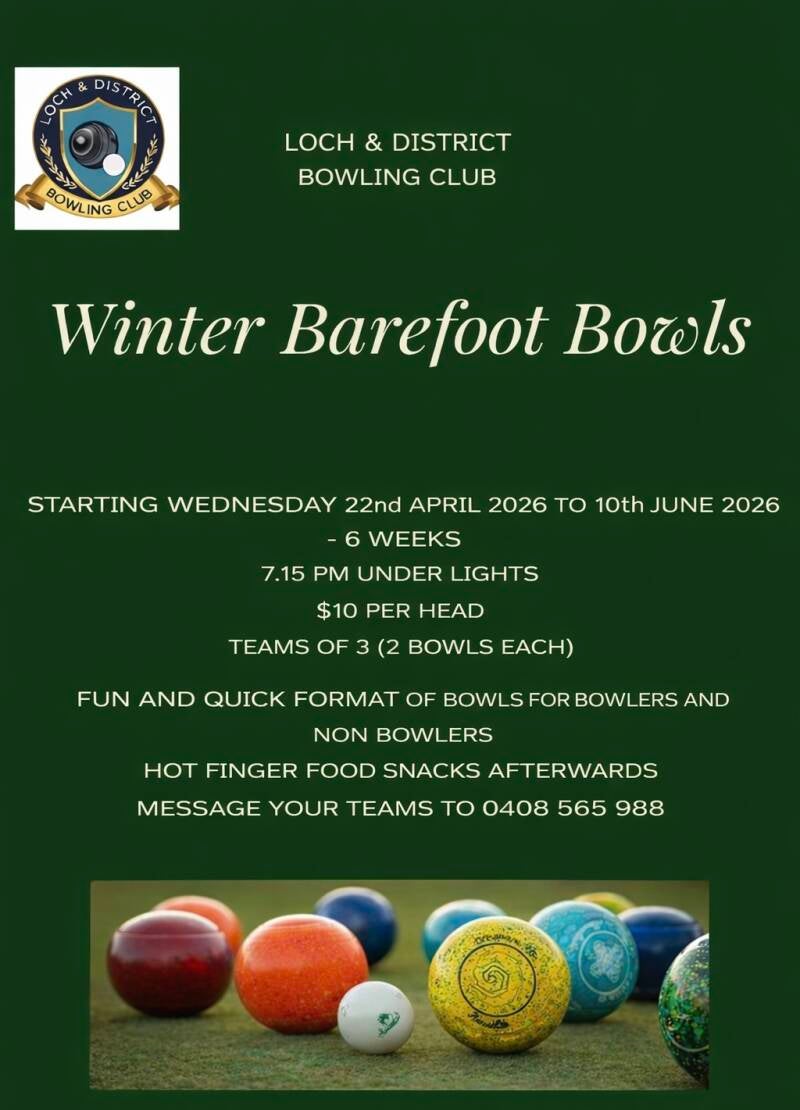 The volunteer run Loch and District Lawn Bowling Club is located at 24 Smith Street, Loch where bowlers of all levels are welcome. A relaxed atmosphere where members and visitors can enjoy a social or competitive game of bowls on our newly laid eight rink synthetic green. Our club is part of the Strzelecki Bowls Region and competes in both Midweek and Weekend Pennant competitions.